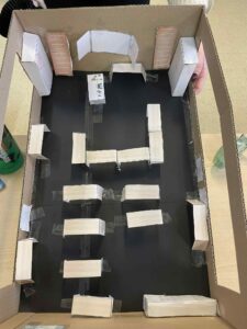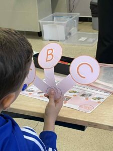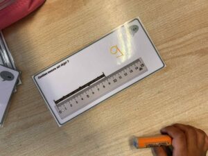 Les élèves de P2 font des petits ateliers pour apprendre à utiliser correctement la latte et bien mesurer.