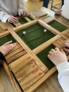 En P4, les élèves travaillent les fractions sous forme de divers ateliers : mémo, bingo, cartes à tâches …
